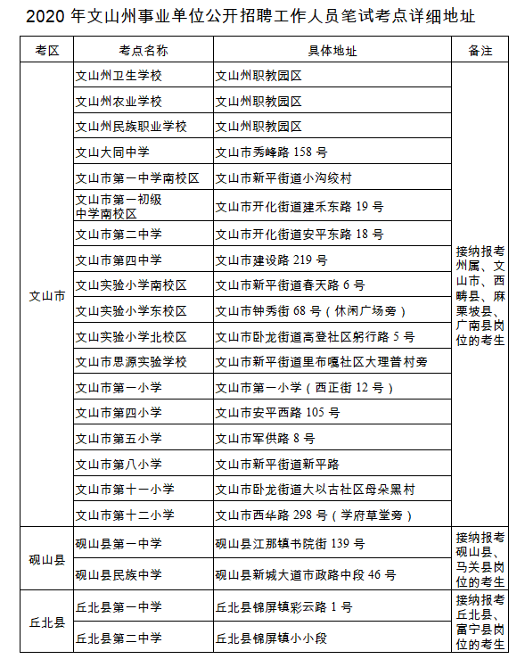 本次筆試文山州共設(shè)置3個考區(qū)、22個考點(diǎn)、1114個考場,其中:文山市考區(qū)設(shè)置18個考點(diǎn)、862個考場,接納報(bào)考州屬、文山市、西疇縣、麻栗坡縣、廣南縣崗位的考生;硯山縣考區(qū)設(shè)置2個考點(diǎn)、109個考場,接納報(bào)考硯山縣、馬關(guān)縣崗位的考生;丘北縣考區(qū)設(shè)置2個考點(diǎn)、143個考場,接納報(bào)考丘北縣、富寧縣崗位的考生。具體考點(diǎn)詳細(xì)地址附后。