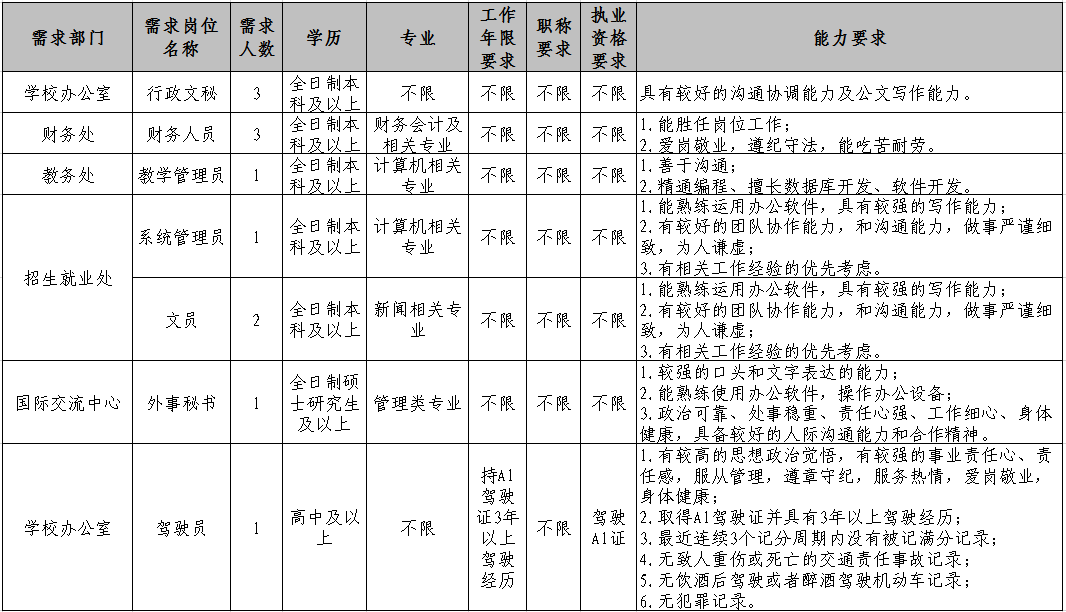為適應學校發(fā)展的需要,需面向社會誠聘12名工作人員,現將有關事項公告如下: