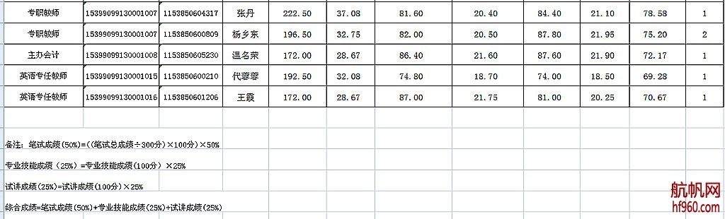 根據(jù)面試人員綜合成績(綜合成績=專業(yè)技能成績×50%+試講面試成績×50% 或 綜合成績=專業(yè)技能成績×25%+試講面試成績×25%+實作成績×50%),按從高到低順序及崗位擬招聘人數(shù)等額確定進(jìn)入考察階段的人員?,F(xiàn)將情況說明及公示如下: