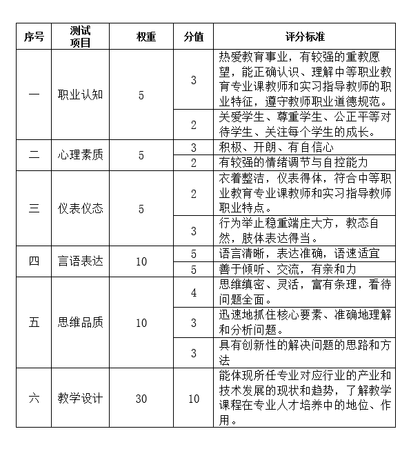 (一)測(cè)試方法采取結(jié)構(gòu)化面試和情境模擬相結(jié)合的方法,通過抽題、備課、專業(yè)概述、試講(演示)、答辯等方式進(jìn)行。