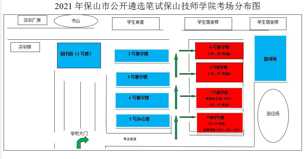 地址:保山市隆陽區(qū)永盛街道大堡子社區(qū)青堡路與堡城南路交會處,考生可乘坐7路、8路、10路、13路、25路公交車到達,考生由南門進入考場。
