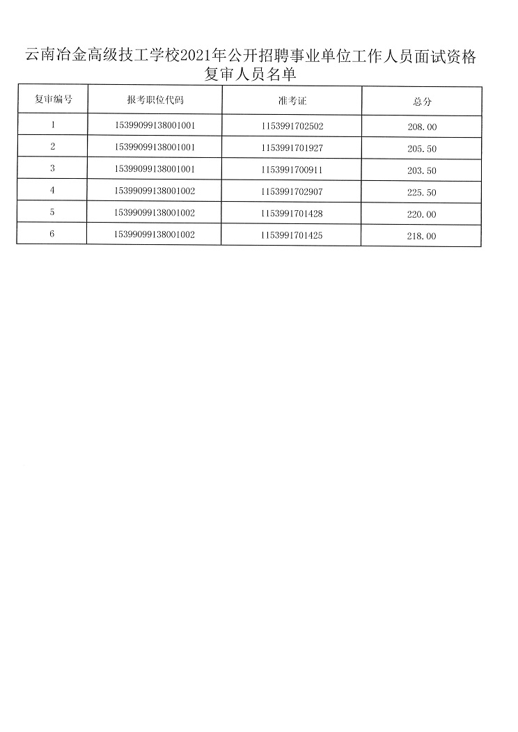 關(guān)于參加云南冶金高級技工學(xué)校2021年公開招聘事業(yè)單位工作人員面試資格復(fù)審人員名單