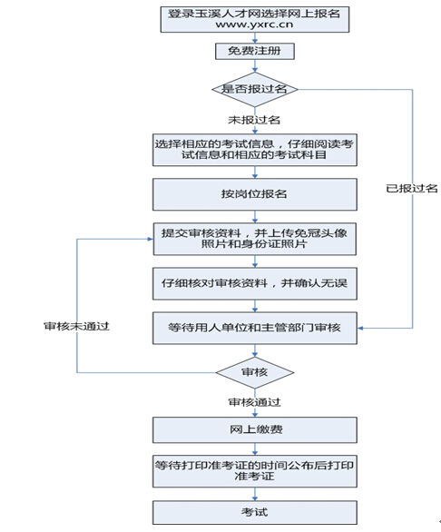網(wǎng)絡(luò)報(bào)名的大致流程為:登錄玉溪人才網(wǎng)→網(wǎng)上報(bào)名入口→注冊→查看招聘崗位→按崗位報(bào)名并填寫報(bào)名資料→等待審核→審核通過→網(wǎng)上交費(fèi)(注意查看交費(fèi)狀態(tài),確認(rèn)交費(fèi)成功)→打印筆試準(zhǔn)考證(打印時(shí)間在筆試公告內(nèi)另行通知)→參加筆試。