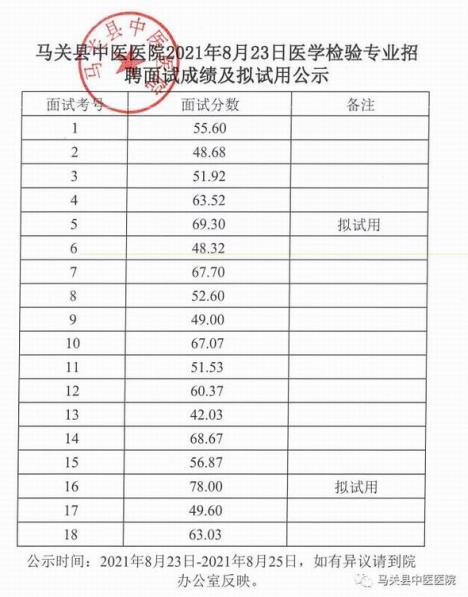 馬關(guān)縣中醫(yī)醫(yī)院2021年8月23日醫(yī)學(xué)檢驗專業(yè)招聘面試成績及擬試用公示