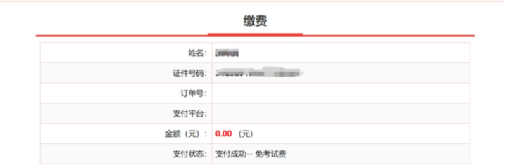 減免申請(qǐng)審核通過后,報(bào)名系統(tǒng)“支付狀態(tài)”欄顯示“支付成功—免考試費(fèi)”字樣(如下圖示),如已繳納報(bào)名費(fèi)的,在確認(rèn)工作結(jié)束后,收費(fèi)平臺(tái)按原繳費(fèi)途徑退費(fèi);未繳費(fèi)的報(bào)考者可不再繳費(fèi)。如報(bào)考者在申請(qǐng)后未按下圖顯示,為確保正常參考,可先行支付報(bào)名費(fèi),待減免申請(qǐng)確認(rèn)后將進(jìn)行退費(fèi)。