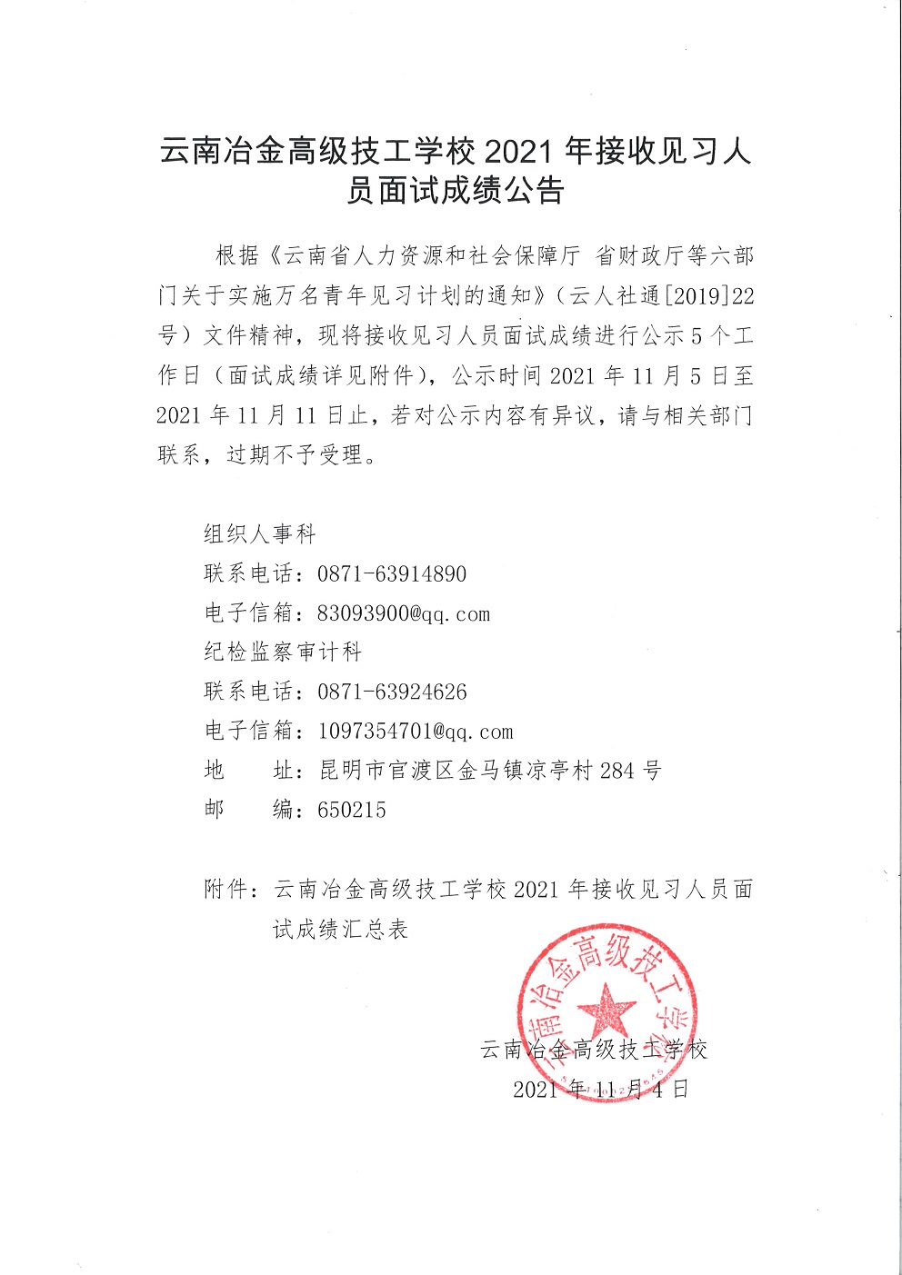 云南冶金高級(jí)技工學(xué)校2021年接收見(jiàn)習(xí)人員面試成績(jī)公告