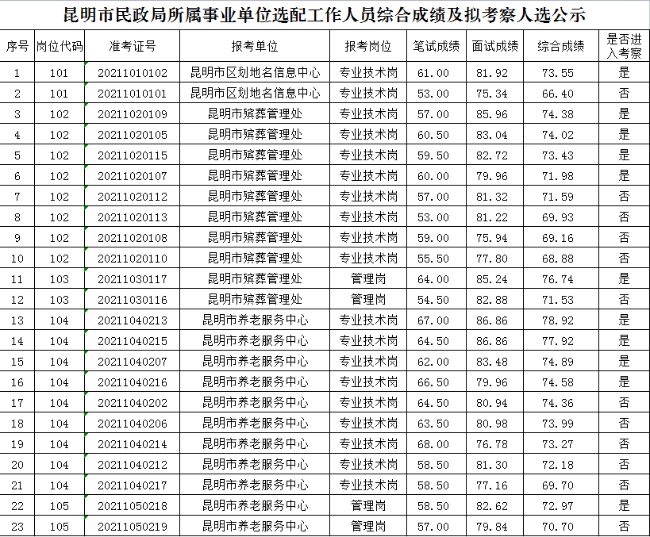 昆明市民政局所屬事業(yè)單位選配工作人員綜合成績(jī)及擬考察人選公示
