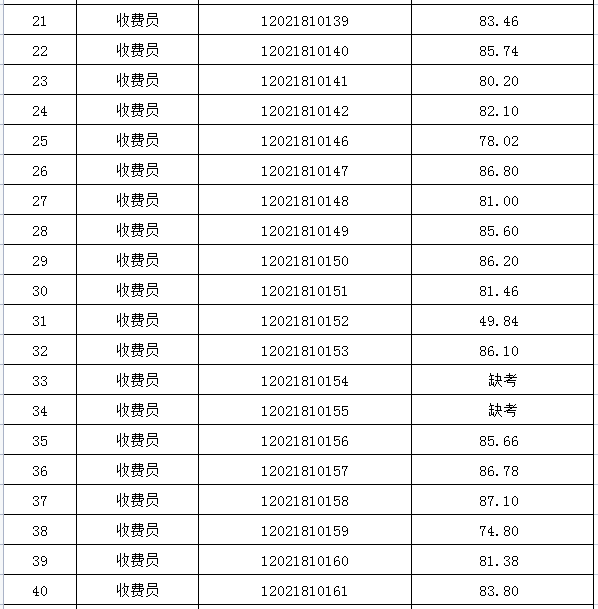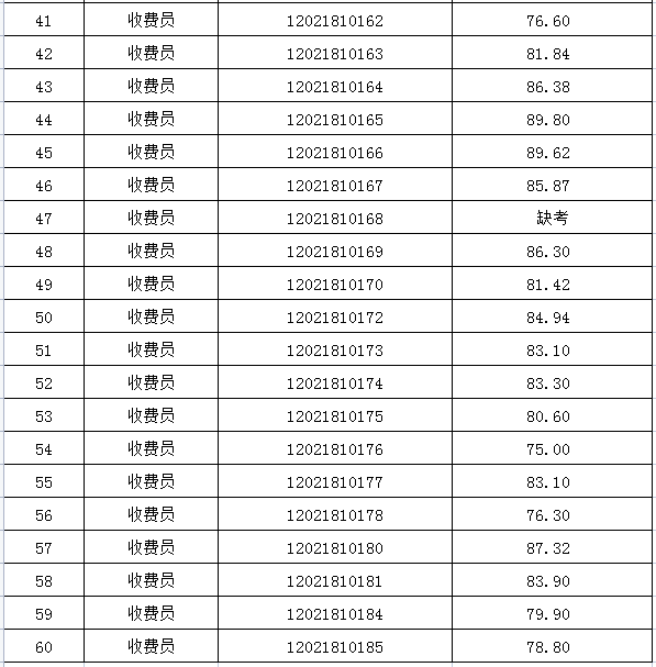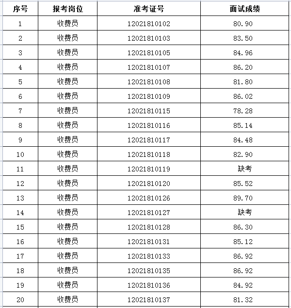 一、收費員崗位面試成績