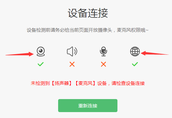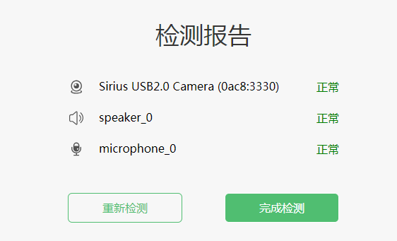 點擊“重新鏈接”或“開始檢測”,根據(jù)實際電腦情況選擇可以看到、可以聽到,完成檢測后,點擊“完成檢測”。