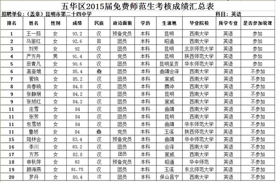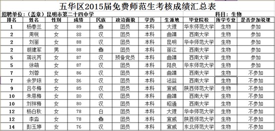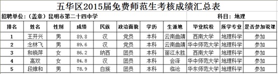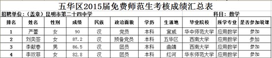 根據(jù)昆明市第二十四中學(xué)公開招聘2015年免費(fèi)師范生的實(shí)施方案,我校組織了數(shù)學(xué)、英語(yǔ)、生物、地理四個(gè)考核小組對(duì)前來(lái)投檔的43位2015屆免費(fèi)師范生進(jìn)行了面試,依據(jù)事先發(fā)布的評(píng)分標(biāo)準(zhǔn)進(jìn)行了認(rèn)真嚴(yán)格地打分,現(xiàn)得出了所有參評(píng)同學(xué)的面試成績(jī),現(xiàn)予以公示。若有疑問,請(qǐng)致電24中考核領(lǐng)導(dǎo)小組辦公室查詢。