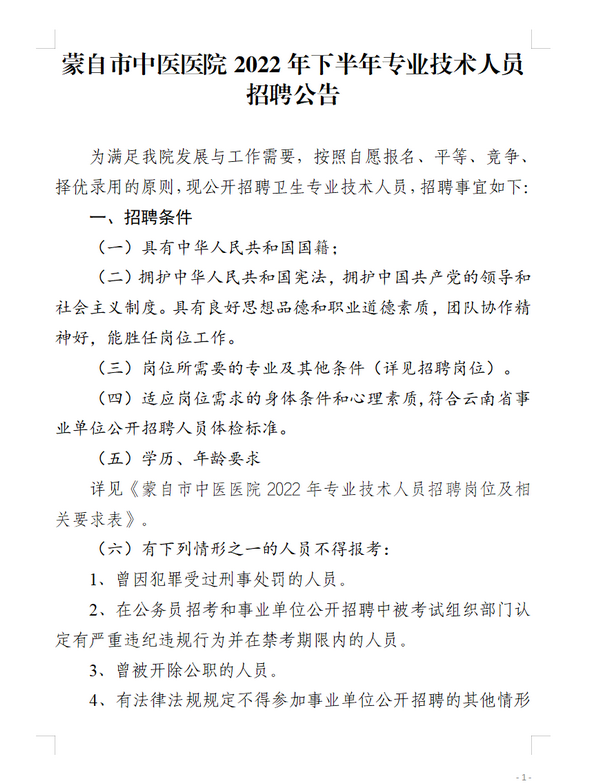 蒙自市中醫(yī)醫(yī)院2022年下半年專業(yè)技術(shù)人員招聘公告.doc