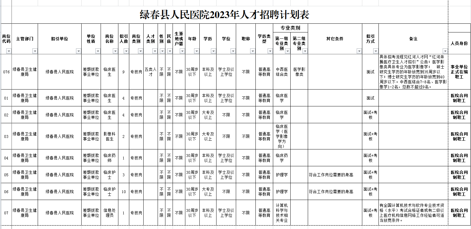 2.醫(yī)院合同制職工25名,具體見附件《綠春縣人民醫(yī)院2023年人才招聘計劃表》,報名截止時間為2023年2 月20日。人員招滿為止,具體面試(考核),結(jié)合現(xiàn)場招聘情況及醫(yī)院安排決定。??茖W歷需要面試、筆試。