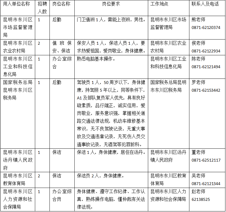 根據(jù)《昆明市人力資源社會(huì)保障局 昆明市財(cái)政局關(guān)于做好公益性崗位開發(fā)管理有關(guān)工作的通知》(昆人社通[2020])37號(hào))文件精神,做好公益性崗位的開發(fā)管理工作,充分發(fā)揮公益性崗位“兜底線、救急難、促脫貧”的作用,因工作需要,現(xiàn)將昆明市東川區(qū)招聘公益性崗位工作人員有關(guān)事宜公告如下: