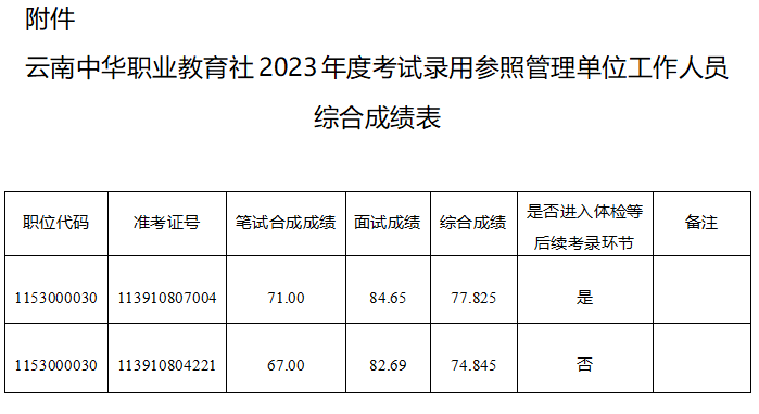 根據(jù)云南省2023年度考試錄用公務(wù)員工作安排,筆試、面試工作已經(jīng)結(jié)束,現(xiàn)將報(bào)考云南中華職業(yè)教育社參照管理單位工作人員考生綜合成績(jī)及后續(xù)工作安排公告如下。