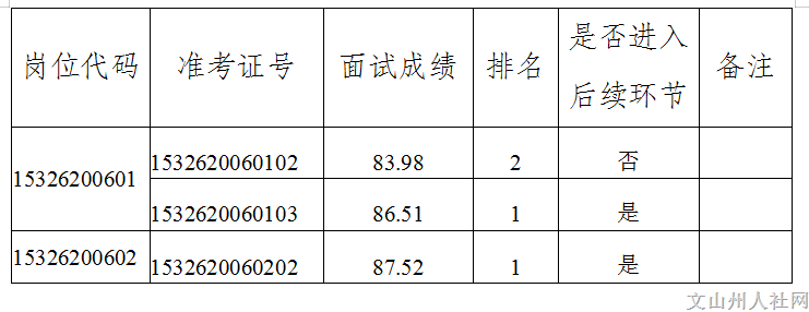 按照《2023年文山州事業(yè)單位緊缺崗位招聘通告》和《文山州財(cái)政局下屬事業(yè)單位2023年緊缺人才招聘通告》的有關(guān)規(guī)定,文山州財(cái)政局下屬事業(yè)單位2023年緊缺人才招聘面試已于2023年4月29日組織開展,現(xiàn)將面試成績及進(jìn)入后續(xù)環(huán)節(jié)人員名單公示如下。
