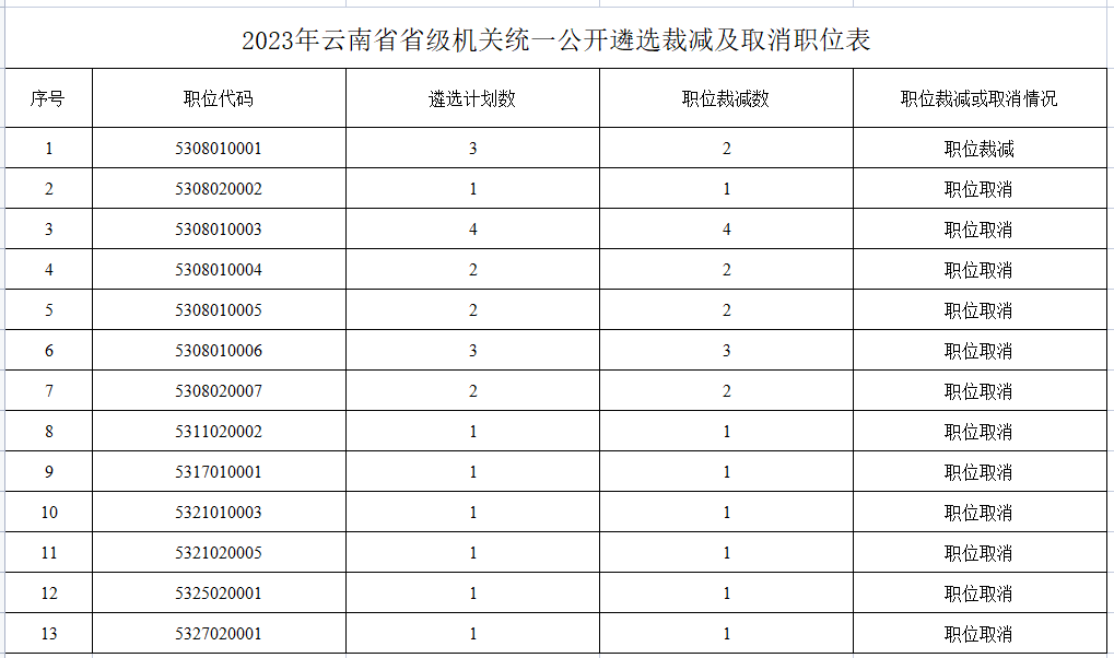 2023年云南省省級機(jī)關(guān)統(tǒng)一公開遴選公務(wù)員報名、資格審查、網(wǎng)上繳費(fèi)工作已結(jié)束。按照《2023年云南省省級機(jī)關(guān)統(tǒng)一公開遴選公務(wù)員公告》,須對未達(dá)到開考比例的1個職位進(jìn)行裁減、12個職位進(jìn)行取消,詳見《2023年云南省省級機(jī)關(guān)統(tǒng)一公開遴選裁減及取消職位表》。