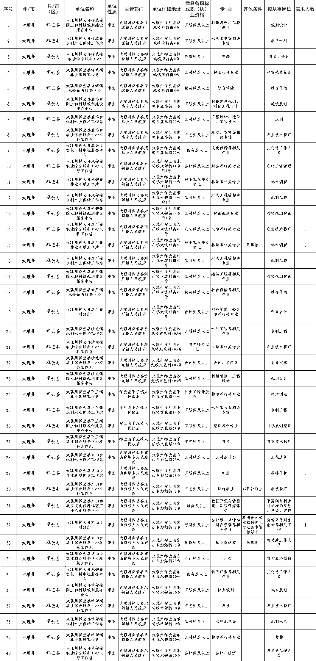 為進一步貫徹落實省委、省政府《關于創(chuàng)新體制機制加強人才工作的意見》(云發(fā)〔2014〕1號)文件精神,省人力資源和社會保障廳、省財政廳下發(fā)《云南省鼓勵專業(yè)技術人員到基層服務暫行辦法》(云人社發(fā)〔2014〕97號)對全省鼓勵專業(yè)技術人員到基層服務工作進行了安排部署。通過對我縣各鄉(xiāng)鎮(zhèn)廣泛征集、篩選,共有40個崗位40人(具體崗位見附表)急需提供相應的專業(yè)技術服務,現予以公告。熱忱歡迎符合條件的廣大專業(yè)技術人員到我縣鄉(xiāng)鎮(zhèn)基層開展服務工作,切實幫助基層解決一些生產和生活中的專業(yè)技術難題。專業(yè)技術人員服務鄉(xiāng)鎮(zhèn)基層工作按照省人力資源和社會保障廳、省財政廳《云南省鼓勵專業(yè)技術人員到基層服務暫行辦法》(云人社發(fā)〔2014〕97號)的相關規(guī)定開展,符合條件人選經單位批準、主管部門審核同意后報同級人力資源和社會保障部門,由同級人力資源和社會保障部門負責與服務單位聯系落實服務基層相關事宜。專業(yè)技術人員服務鄉(xiāng)鎮(zhèn)基層期滿補助按照《中共大理州委大理州人民政府關于創(chuàng)新體制機制加強人才工作的實施意見》(大發(fā)〔2014〕23號)文件規(guī)定執(zhí)行。