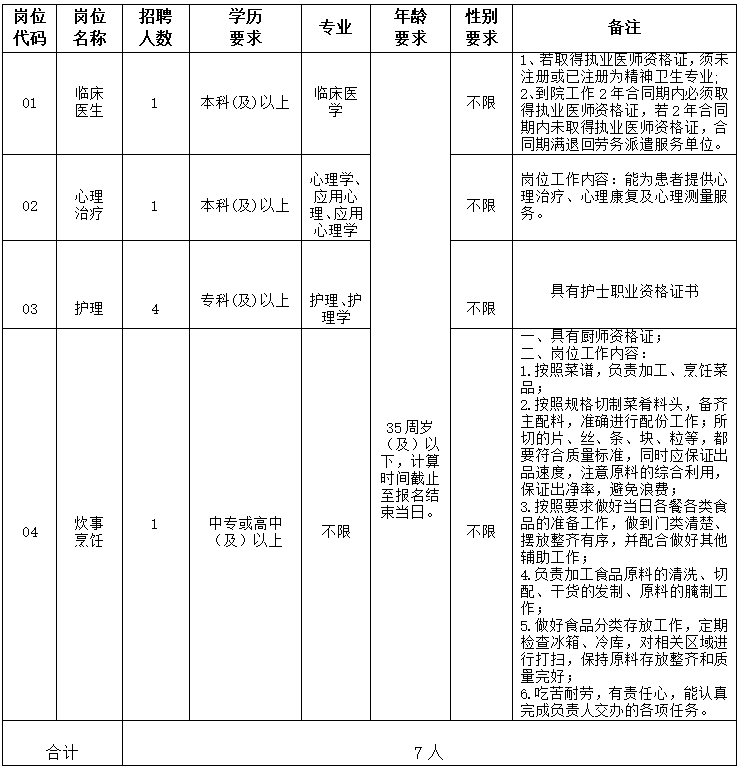根據(jù)昆明市精神病院工作開展需要,現(xiàn)面向社會公開招聘7名勞務(wù)派遣人員,本次招聘將委托第三方招聘服務(wù)機構(gòu)全程負責,招聘遵循“公開、公平、競爭、擇優(yōu)”的原則,工作人員嚴格按照公開發(fā)布招聘公告、報名、資格審核、筆試、面試、綜合考察、體檢、公示、錄用的程序進行,現(xiàn)將有關(guān)招聘事宜公告如下: