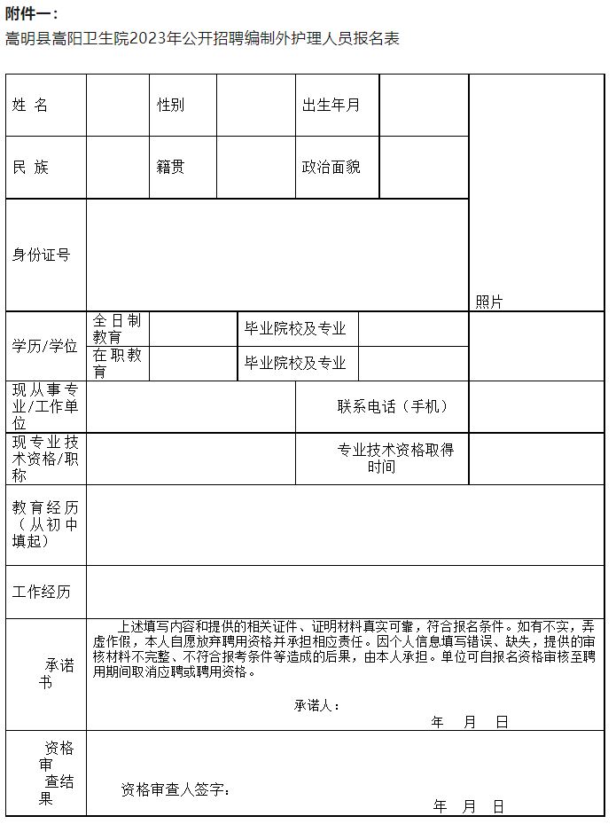 十、紀律要求1.報考人員填寫或提交個人資料要做到全面、真實、準確、有效,不得隱瞞真實情況、弄虛作假。對違反公開招聘紀律或不具備應(yīng)聘資格、弄虛作假、隱瞞真實情況的報考人員,取消其考試或聘用資格。2.報名后,報考人員應(yīng)注意及時了解招聘工作進程和有關(guān)事項的通知,并保持聯(lián)系電話暢通。若因報考人員不及時查看公告或聯(lián)系電話不暢通而造成的后果,由報考人員本人負責。3.招聘單位負責人和相關(guān)人員與應(yīng)試人員中有夫妻關(guān)系、直系血親關(guān)系、三代以內(nèi)旁系血親或者近姻親關(guān)系可能影響招聘公正的,應(yīng)當回避。4.本次招考活動各環(huán)節(jié)接受紀檢監(jiān)察部門、主管局及社會各界監(jiān)督。5.監(jiān)督電話:嵩明縣人力資源和社會保障局:0871-67913783縣衛(wèi)生健康局:0871—67911779十一、其他1.本方案由醫(yī)院負責解釋。聯(lián)系人:楊老師聯(lián)系電話:0871-679230002.附件:《嵩明縣嵩陽衛(wèi)生院2023年公開招聘編制外人員報名表》。