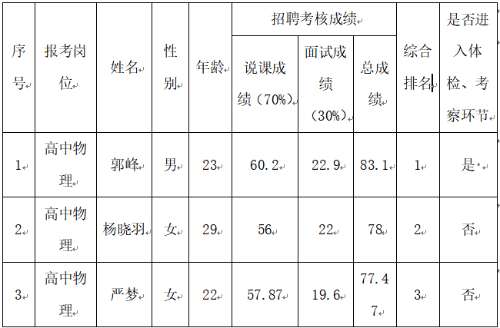 根據(jù)《昆明市晉寧區(qū)第二中學2023年公開招聘臨聘教師招聘簡章》,學校于2023年7月27日對報考我校高中物理教學崗位資格復審通過的3位教師進行說課、面試考核,郭峰以總成績83.1分,綜合排名第一,將進入體檢、考察環(huán)節(jié);具體情況公示如下: