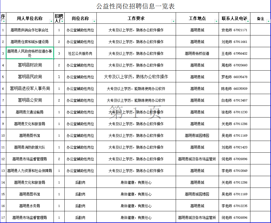 三、其它招聘具體事宜請(qǐng)咨詢用人單位。符合公益性崗位上崗條件的個(gè)人也可以到嵩明縣勞動(dòng)就業(yè)服務(wù)局綜合科申請(qǐng)公益性崗位求職登記,詳詢陳老師:0871-67917444。附件:《公益性崗位招聘信息一覽表》