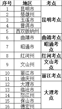4、考試地點(diǎn):昆明、曲靖、昭通、紅河、文山、麗江、大理