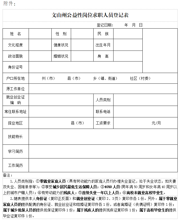 (5)《公益性崗位求職人員登記表》、《硯山縣自然資源局公益性崗位招聘誠信承諾書》;