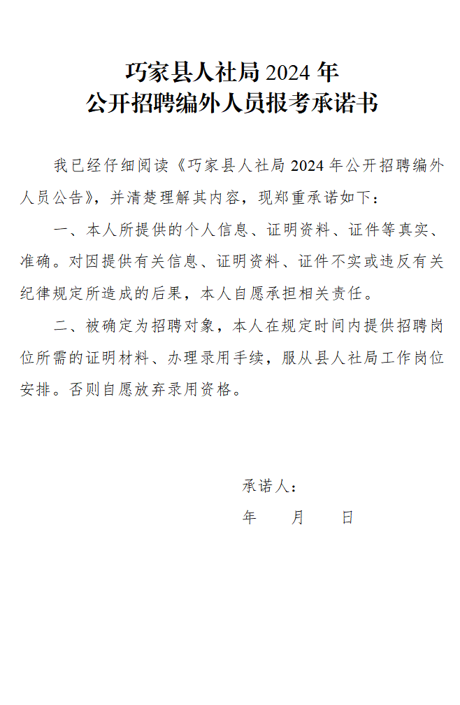 (2)巧家縣人社局2024年公開招聘編制外人員報(bào)考承諾書。
