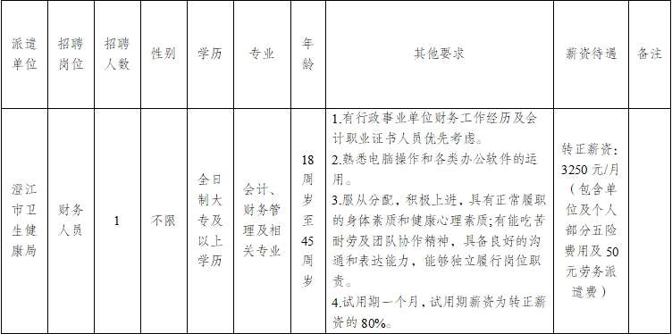 澄江市衛(wèi)健局因工作需要,委托澄江市啟澄人力資源有限責(zé)任公司,面向社會(huì)公開招聘財(cái)務(wù)人員1名,現(xiàn)將有關(guān)事項(xiàng)公告如下: