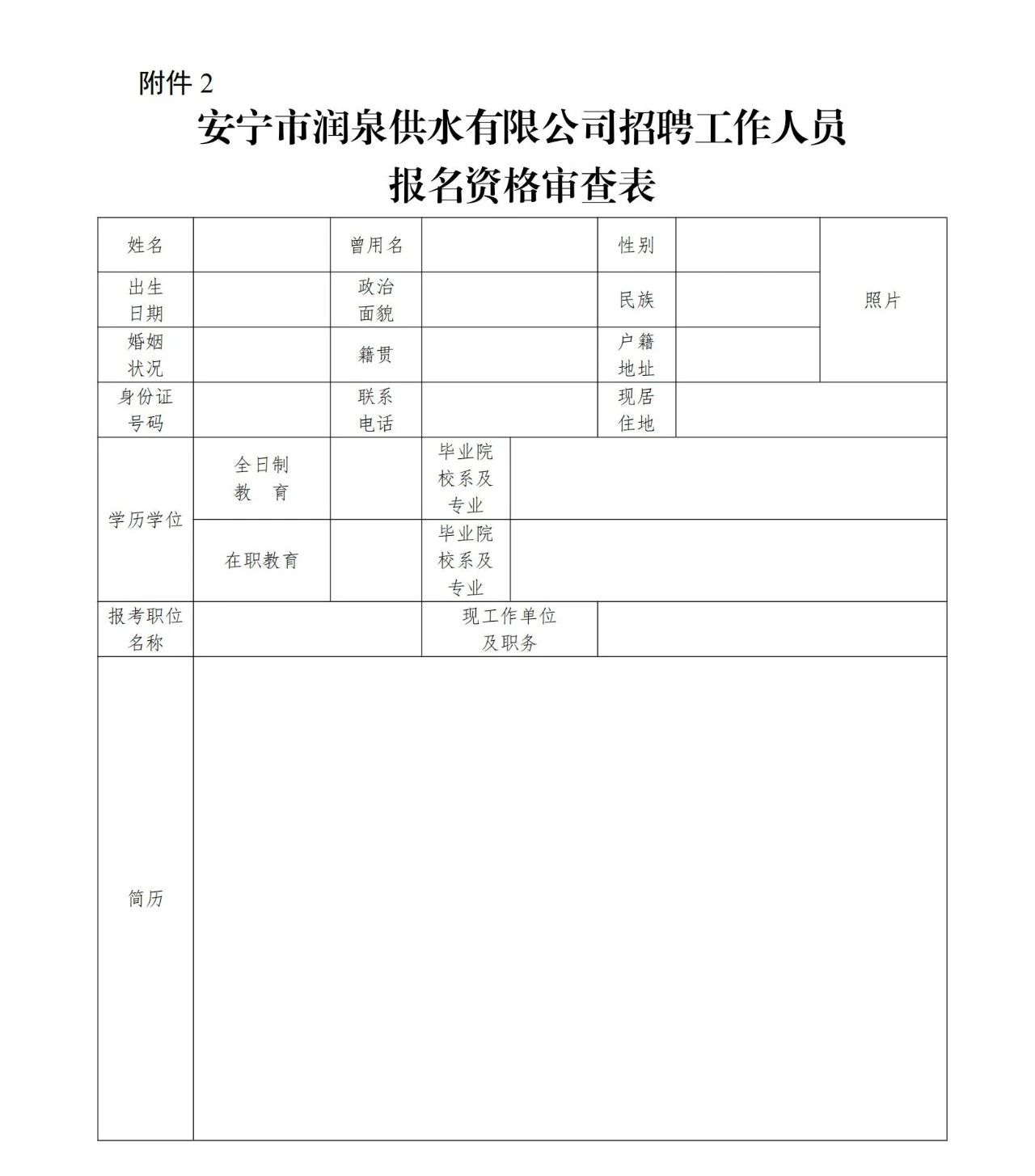 2.安寧市潤泉供水有限公司招聘工作人員報(bào)名資格審查表