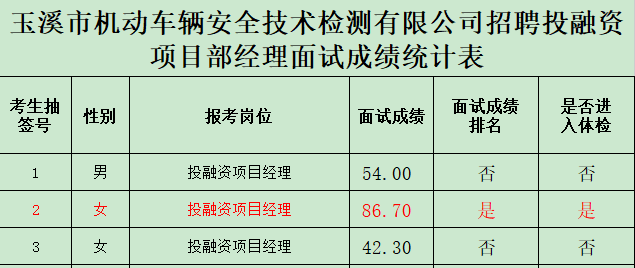 玉溪市機(jī)動(dòng)車輛安全技術(shù)檢測(cè)有限公司招聘投融資項(xiàng)目部經(jīng)理已于2024年2月23日開(kāi)考并順利結(jié)束,共3人報(bào)名,3人參加面試,擬錄用1人,現(xiàn)將面試成績(jī)、進(jìn)入體檢人員名單及體檢相關(guān)事宜公布如下: