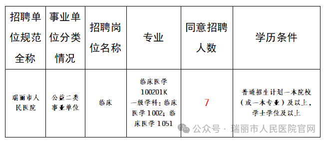 根據(jù)《德宏州人力資源和社會(huì)保障局關(guān)于印發(fā)2024年教育衛(wèi)生部門考核招聘緊缺專業(yè)學(xué)科優(yōu)秀人才工作方案的通知》(德人社發(fā)〔2024〕2號(hào))文件,同意瑞麗市人民醫(yī)院招聘編制內(nèi)衛(wèi)生專業(yè)技術(shù)人員7名,現(xiàn)將相關(guān)事宜預(yù)公告如下。