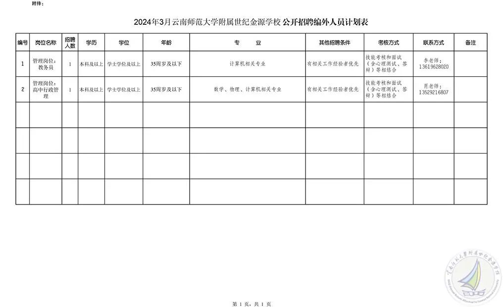 參照《云南省事業(yè)單位公開招聘工作人員辦法》(云人社發(fā)〔2016〕182號)等有關(guān)文件規(guī)定,結(jié)合工作需要,經(jīng)學(xué)校研究,決定面向社會公開招聘編外教務(wù)員1名,編外高中行政管理員1名,共計招聘2名。具體招聘范圍和條件,詳見《2024年3月云南師范大學(xué)附屬世紀(jì)金源學(xué)校公開招聘編外人員計劃表》(附件1)