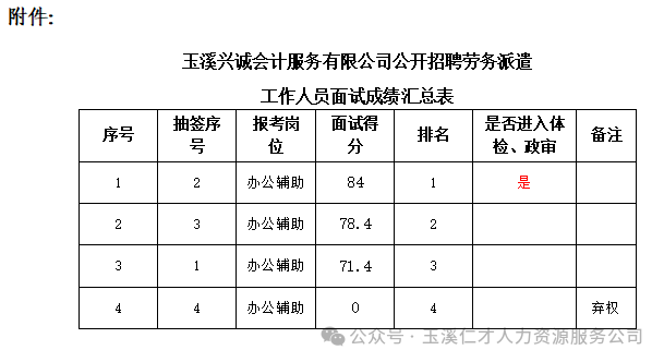 附件:玉溪興誠會計服務(wù)有限公司公開招聘勞務(wù)派遣工作人員公告面試成績匯總表