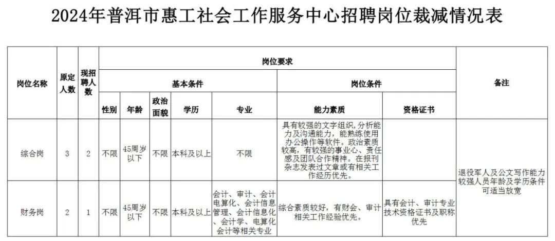 附件:2024年普洱市惠工社會工作服務(wù)中心招聘裁減崗位表