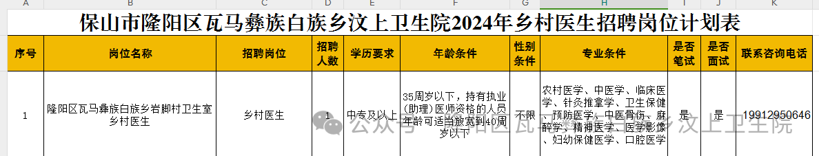 為進(jìn)一步加強(qiáng)保山市隆陽區(qū)瓦馬彝族白族鄉(xiāng)汶上衛(wèi)生院轄區(qū)各村鄉(xiāng)村醫(yī)生隊(duì)伍建設(shè),合理配備鄉(xiāng)村醫(yī)生,更好的滿足農(nóng)村居民日益增長的醫(yī)療衛(wèi)生需求,貫徹落實(shí)“強(qiáng)基層”的重要目標(biāo),推動(dòng)保山市隆陽區(qū)瓦馬彝族白族鄉(xiāng)汶上衛(wèi)生院衛(wèi)生健康事業(yè)的發(fā)展,保山市隆陽區(qū)瓦馬彝族白族鄉(xiāng)汶上衛(wèi)生院決定對(duì)汶上衛(wèi)生院轄區(qū)巖腳村衛(wèi)生室鄉(xiāng)村醫(yī)生崗位進(jìn)行公開招聘,現(xiàn)將有關(guān)事項(xiàng)公告如下: