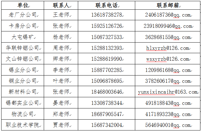 | 錫業(yè)分公司 | 冶煉技術(shù)員 | 錫冶煉工藝技術(shù)管理及技術(shù)指導(dǎo),新工藝研發(fā),錫冶煉技術(shù)管理 | 云南蒙自 | 冶金工程專業(yè)、化學(xué)工程與技術(shù)、應(yīng)用化學(xué)、材料學(xué) | 本科及以上 | 1 | |
