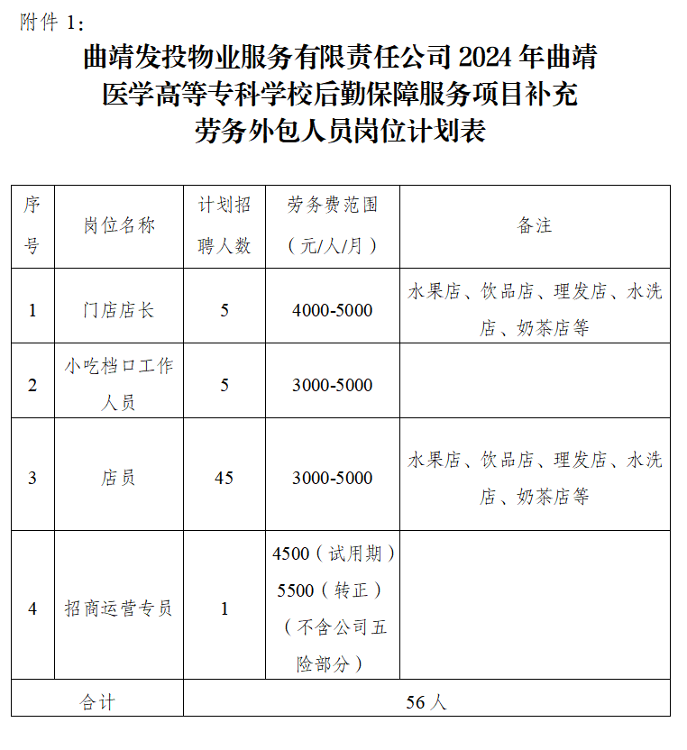 本次計(jì)劃招聘市場(chǎng)化用工人員56人,分類(lèi)見(jiàn)附件一:《曲靖發(fā)投物業(yè)服務(wù)有限責(zé)任公司2024年曲靖醫(yī)學(xué)高等專(zhuān)科學(xué)校后勤保障服務(wù)項(xiàng)目公開(kāi)招聘第一批次勞務(wù)外包人員崗位計(jì)劃表》。