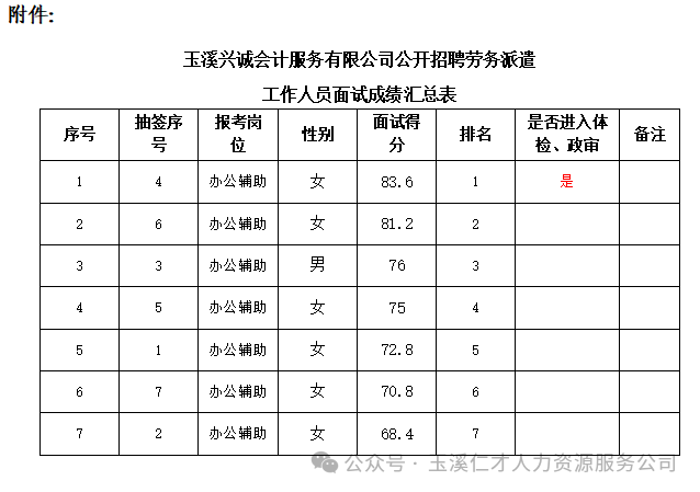 附件:玉溪興誠會(huì)計(jì)服務(wù)有限公司公開招聘勞務(wù)派遣工作人員公告面試成績匯總表