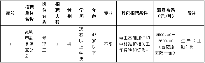 (一)生產(chǎn)(工勤)崗位1個(gè):修理工1名。