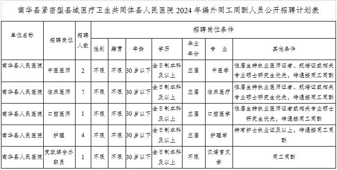 南華縣緊密型縣域醫(yī)療衛(wèi)生共同體縣人民醫(yī)院始建于1941年11月,是全縣唯一一所集醫(yī)療、急救、教學(xué)、科研、保健于一體的二級(jí)甲等綜合醫(yī)院?,F(xiàn)有開(kāi)放床位404張,職工504人。為進(jìn)一步加強(qiáng)南華縣人民醫(yī)院人才隊(duì)伍建設(shè),改善人才隊(duì)伍結(jié)構(gòu),提高服務(wù)能力,促進(jìn)衛(wèi)生事業(yè)的可持續(xù)發(fā)展,根據(jù)《楚雄州事業(yè)單位公開(kāi)招聘工作人員實(shí)施意見(jiàn)》(楚人社發(fā)〔2013〕16號(hào)),決定面向普通高等醫(yī)學(xué)院校畢業(yè)生招聘專業(yè)技術(shù)人才14名,其中:臨床醫(yī)學(xué)專業(yè)7名,口腔醫(yī)師1名,中醫(yī)2名,護(hù)理4名,黨政綜合辦職員1名,共計(jì)15名?,F(xiàn)將招聘有關(guān)事宜公告如下: