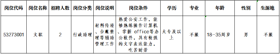 本次招錄共設(shè)1個(gè)崗位,男性2人。詳情請(qǐng)關(guān)注“西盟警方”微信公眾號(hào)查詢。