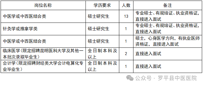 羅平縣中醫(yī)醫(yī)院因業(yè)務(wù)拓展需要,計(jì)劃2024年自主招聘同工同酬編制外中醫(yī)類(lèi)碩士研究生15名,臨床醫(yī)師2名,會(huì)計(jì)師1名,根據(jù)相關(guān)規(guī)定制定如下方案: