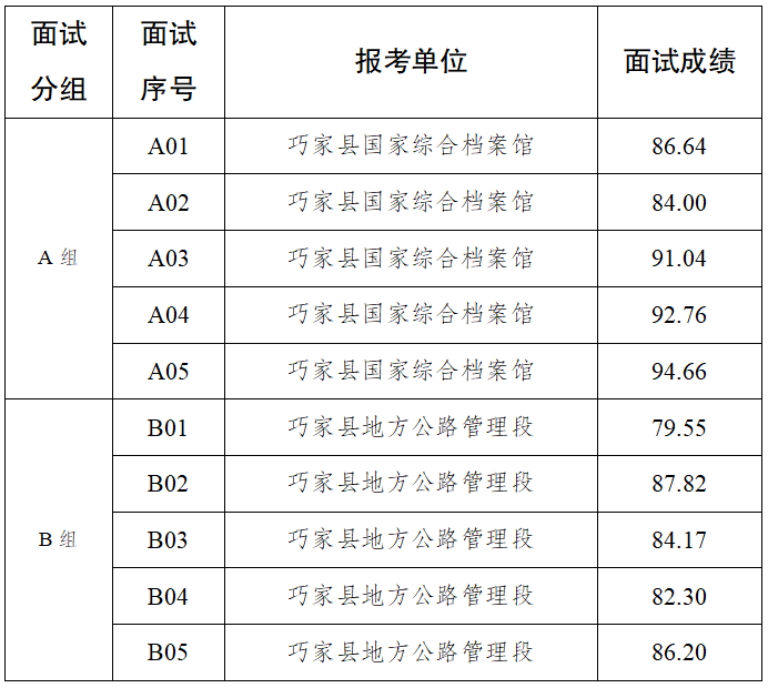 根據(jù)《昭通市2024年事業(yè)單位公開招聘優(yōu)秀緊缺專業(yè)技術(shù)人才實施辦法》和《巧家縣2024年事業(yè)單位公開招聘優(yōu)秀緊缺高層次專業(yè)技術(shù)人才通告》,巧家縣2024年事業(yè)單位公開招聘優(yōu)秀緊缺高層次專業(yè)技術(shù)人才面試工作已結(jié)束,現(xiàn)將面試成績予以公示,公示期為7個工作日。