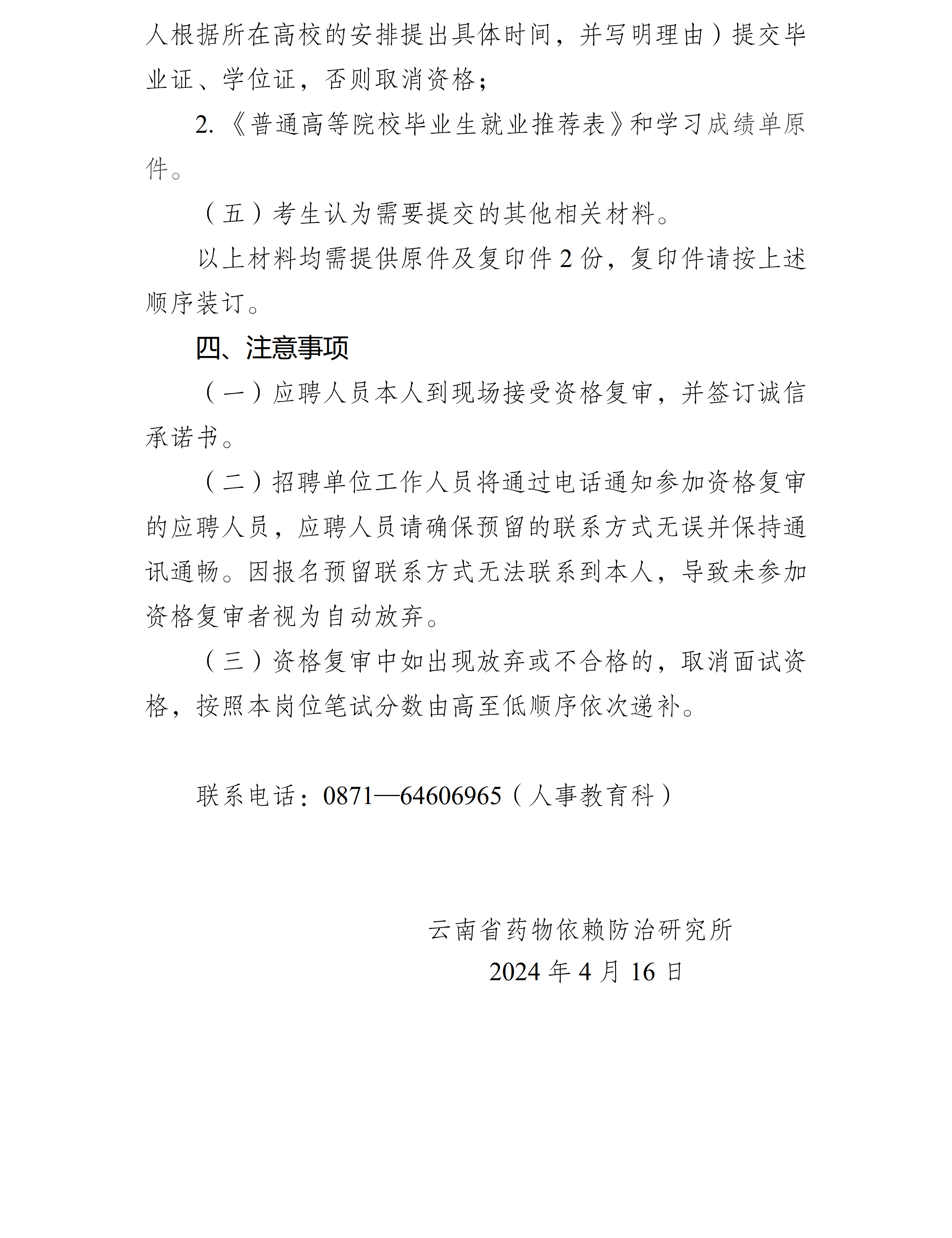 云南省藥物依賴防治研究所 2024年面向社會公開招聘工作人員資格復審注意事項