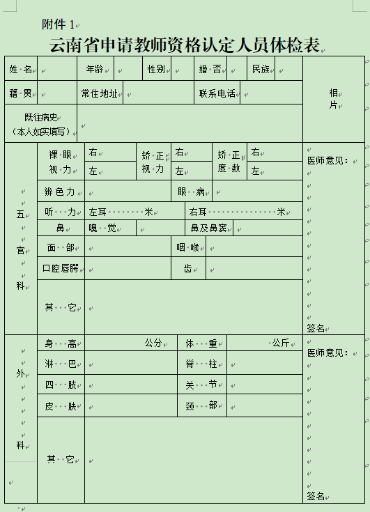 云南省申請(qǐng)教師資格認(rèn)定人員體檢表云南省申請(qǐng)教師資格認(rèn)定人員體檢表
