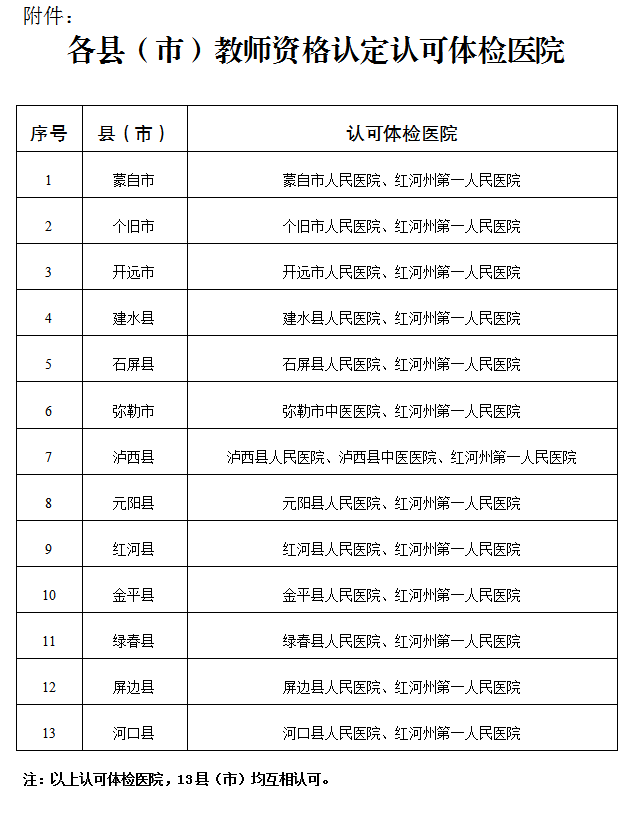 (四)能適應(yīng)教育教學(xué)工作的需要,具有良好的身體素質(zhì)和心理素質(zhì)。申請人須按照《教育部教師資格認(rèn)定指導(dǎo)中心關(guān)于調(diào)整申請認(rèn)定幼兒園教師資格人員體檢標(biāo)準(zhǔn)的通知》(教資字〔2010〕15號)、《人力資源和社會保障部教育衛(wèi)生部關(guān)于進(jìn)一步規(guī)范入學(xué)和就業(yè)體檢項(xiàng)目維護(hù)乙肝表面抗原攜帶者入學(xué)和就業(yè)權(quán)利的通知》(人社部發(fā)〔2010〕12號)、《云南省申請教師資格人員體檢辦法》(詳見省教育廳公告)要求,在教師資格認(rèn)定機(jī)構(gòu)認(rèn)可的縣級以上醫(yī)院體檢合格(紅河州認(rèn)可醫(yī)院詳見附件)。