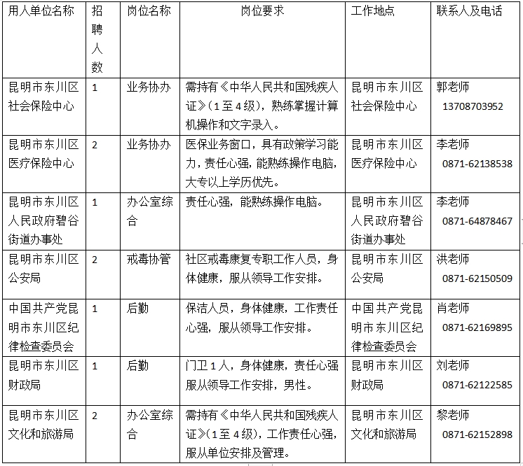昆明市東川區(qū)社會(huì)保險(xiǎn)中心等七個(gè)單位公益性崗位招聘啟事