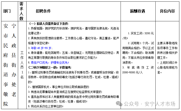3.資格審查:凡報名人員通過微信投遞簡歷成功的,均由第三方人力資源公司負(fù)責(zé)在線上進行資格初審,初審?fù)ㄟ^后,連同報名資料一并報安寧市人民政府八街敬老院復(fù)審。