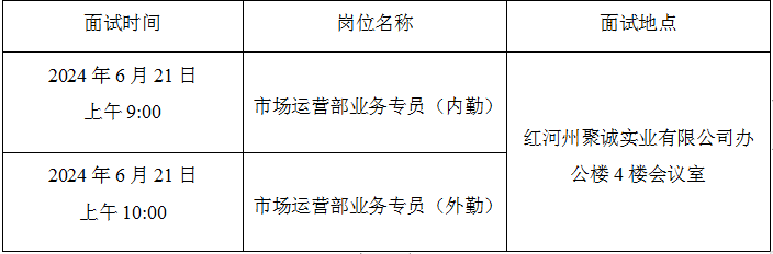 紅河州聚誠(chéng)實(shí)業(yè)有限公司(以下簡(jiǎn)稱(chēng):公司)于2024年6月14日進(jìn)行市場(chǎng)運(yùn)營(yíng)部業(yè)務(wù)專(zhuān)員崗(內(nèi)勤)、業(yè)務(wù)專(zhuān)員崗(外勤)招聘筆試。各招聘崗位進(jìn)入筆試人員共計(jì)49人,實(shí)到參考人員共31人,現(xiàn)將參加筆試人員成績(jī)和進(jìn)入面試人員名單公示如下(詳見(jiàn)附件):